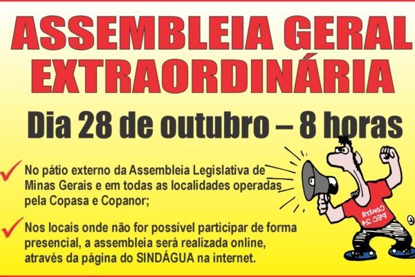O SINDÁGUA convoca todos os trabalhadores e trabalhadoras para uma grande mobilização no dia 28, terça-feira, em frente à Assembleia Legislativa onde definiremos os rumos de nossa luta, alertando que a CCJ da ALMG voltará a discutir a PEC 24 (do Cala a Boca) para cassar o referendo popular. No local, realizaremos uma ASSEMBLEIA GERAL…