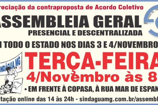 A categoria decidiu nas assembleias que todos os trabalhadores e trabalhadoras devem cruzar os braços a partir do próximo dia 4 de novembro, mantendo nossa luta contra a PEC 24 e pela preservação do direito constitucional da população mineira ao REFERENDO. O SINDÁGUA convoca também toda a categoria para se posicionar sobre a contraproposta da…