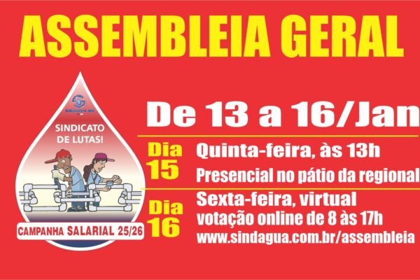 O SINDÁGUA recebeu da Copasa uma nova proposta para a celebração do Acordo Coletivo de Trabalho (ACT) 2025/2027 e, adicionalmente, de um Acordo Extraordinário para Jornada de Turno Ininterrupto de Trabalho, destinado às localidades que exigem funcionamento 24 horas por dia. A proposta para o ACT 2025/2027 mantém os termos anteriormente anunciados, mas com a…