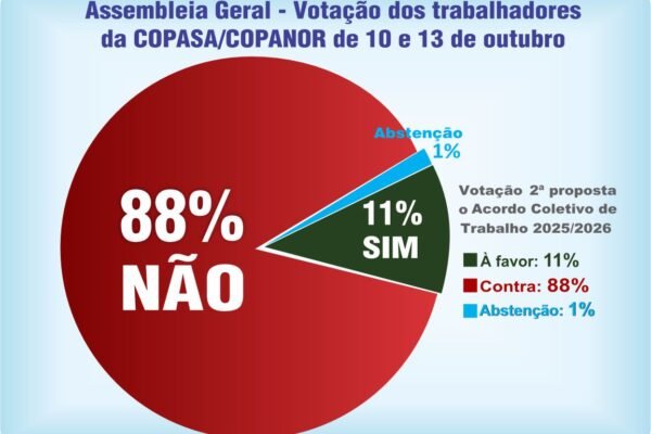 Os trabalhadores na Copasa e Copanor em todo o Estado VÃO PARA AS RUAS, CRUZAM OS BRAÇOS e se UNEM na defesa do povo sobre seu direito ao REFERENDO para decidir se permite a privatização da Copasa. Com responsabilidade e consciência, nosso movimento vai garantir o abastecimento de água, coleta e tratamento de esgotos em…